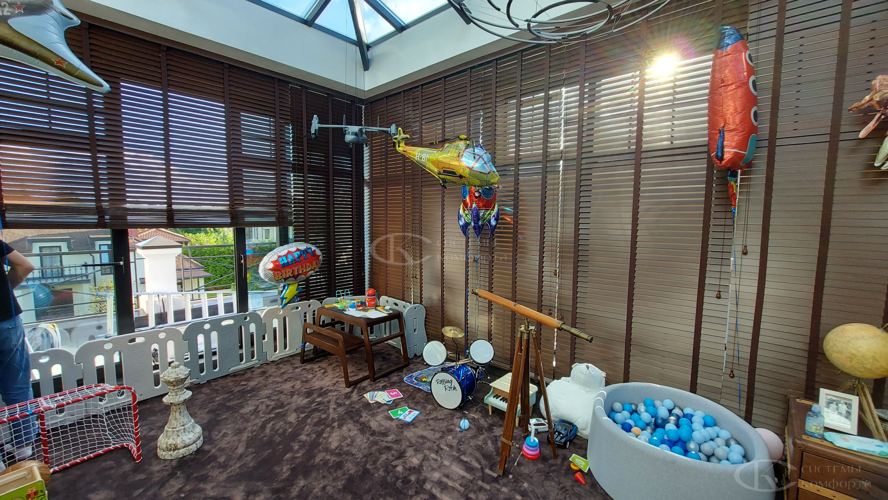 - Тип системы. Горизонтальные алюминиевые – наиболее бюджетный вариант, деревянные, римские шторы или системы с электроприводом будут дороже.