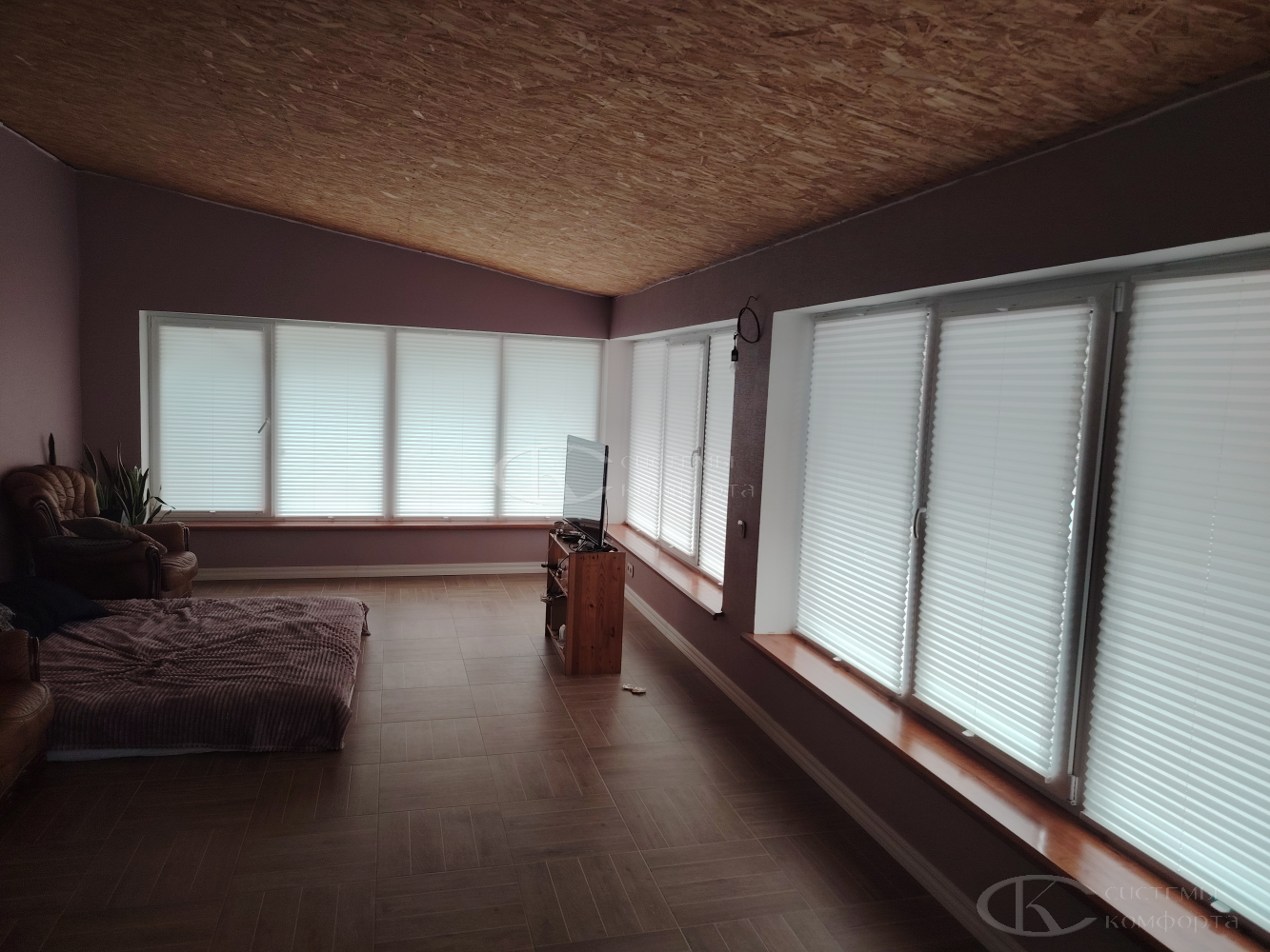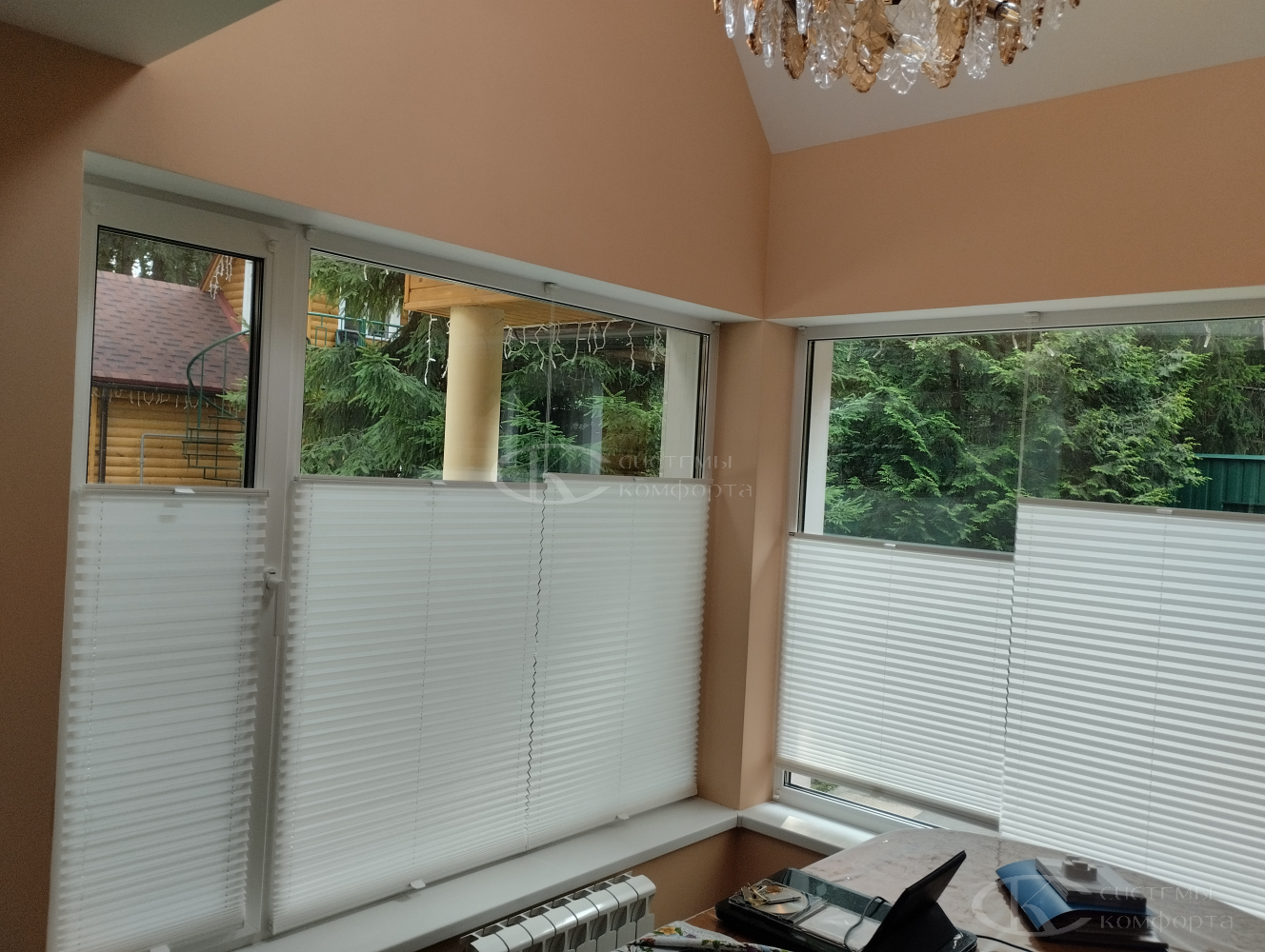 Их конструкция представляет собой ткань, собранную в равномерные, изящные складки-гармошки, способные изгибаться по заданной траектории. Именно эта особенность делает плиссе единственно верным решением для треугольных, арочных, трапециевидных или круглых окон, которые часто становятся архитектурной изюминкой загородного дома.