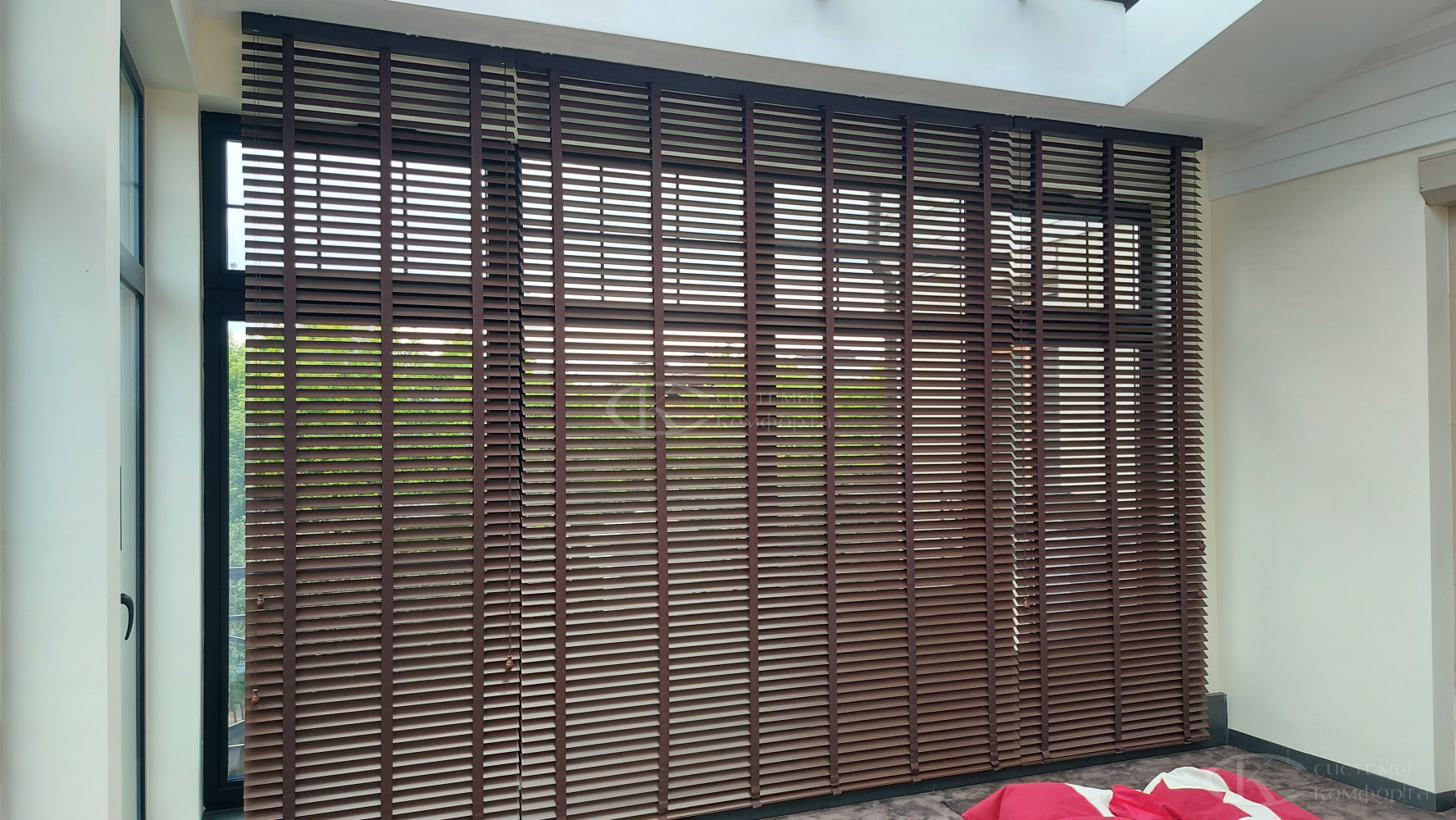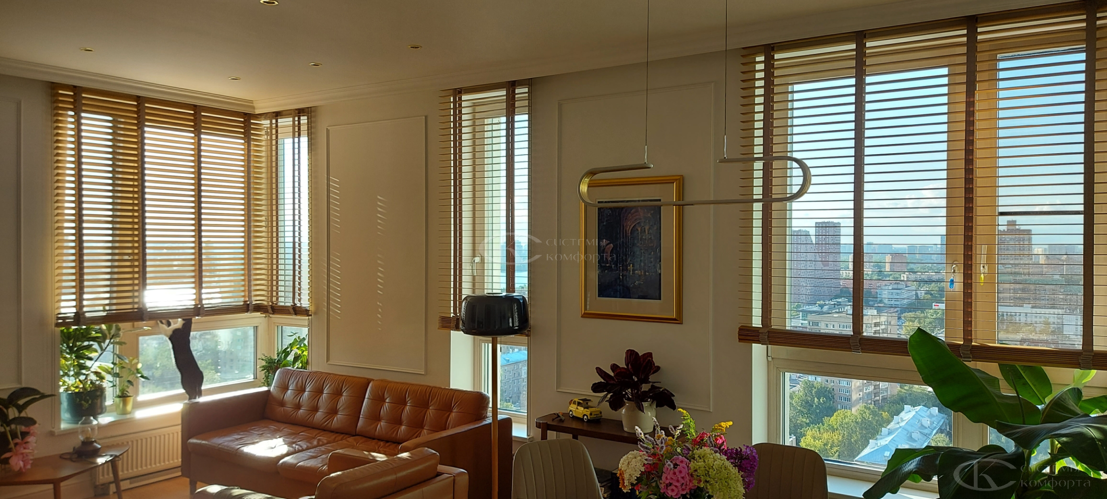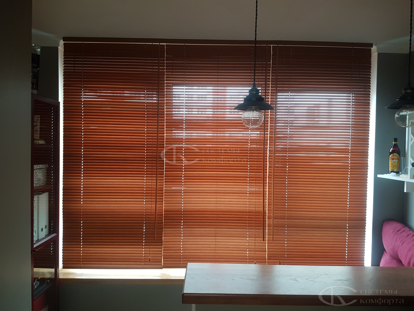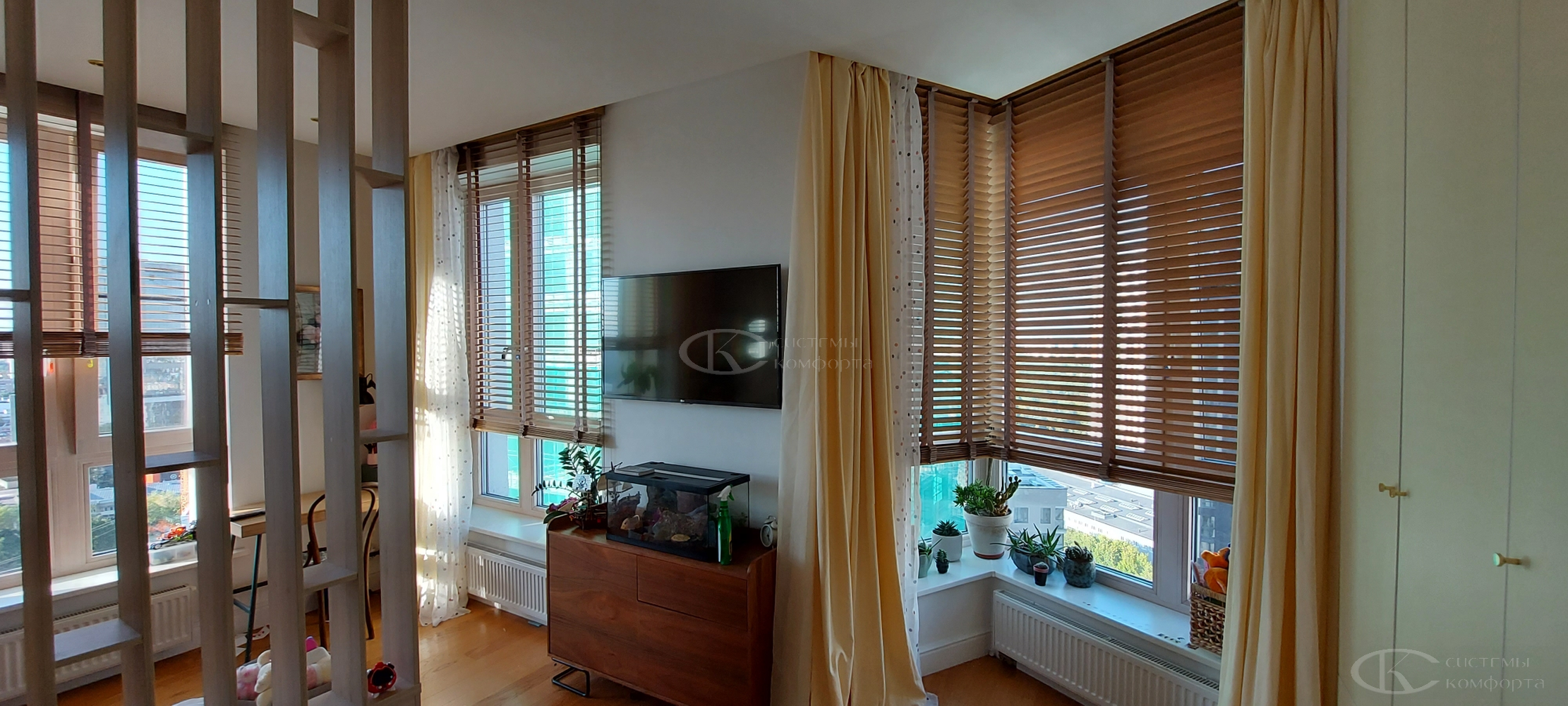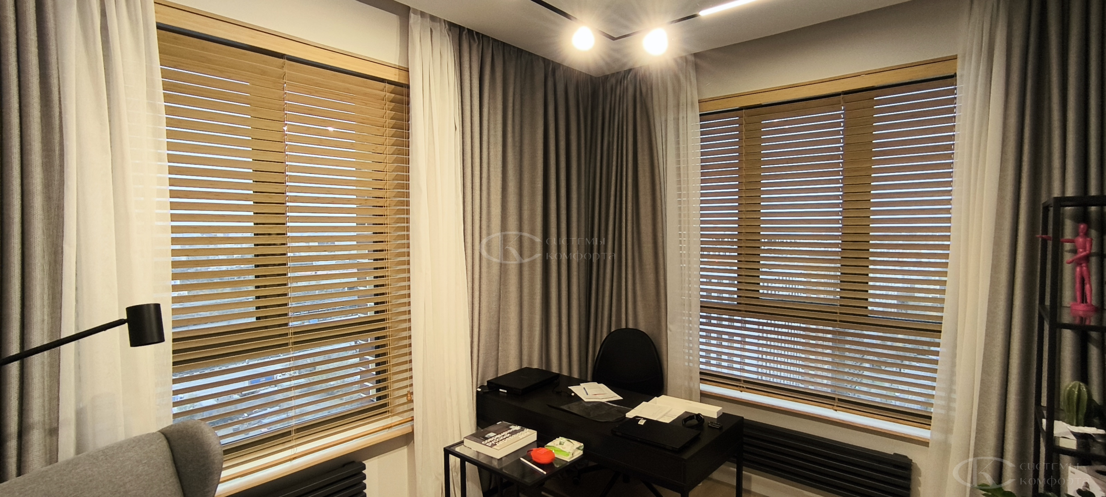 - Гостиная/кабинет: эстетика, стиль, управление светом для комфортной работы и отдыха. Деревянные горизонтальные, вертикальные тканевые, римские шторы, плиссе.